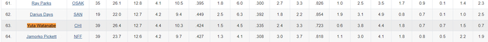 其实本赛季渡边在B联赛也属于二流水准,场均12.7分(联赛第63)4.5篮板1.9助攻0.8抢断0.8盖帽,命中率42.5%,三分命中率33.5%,他在B联赛也不是顶级水准了,他在嚣张什么?